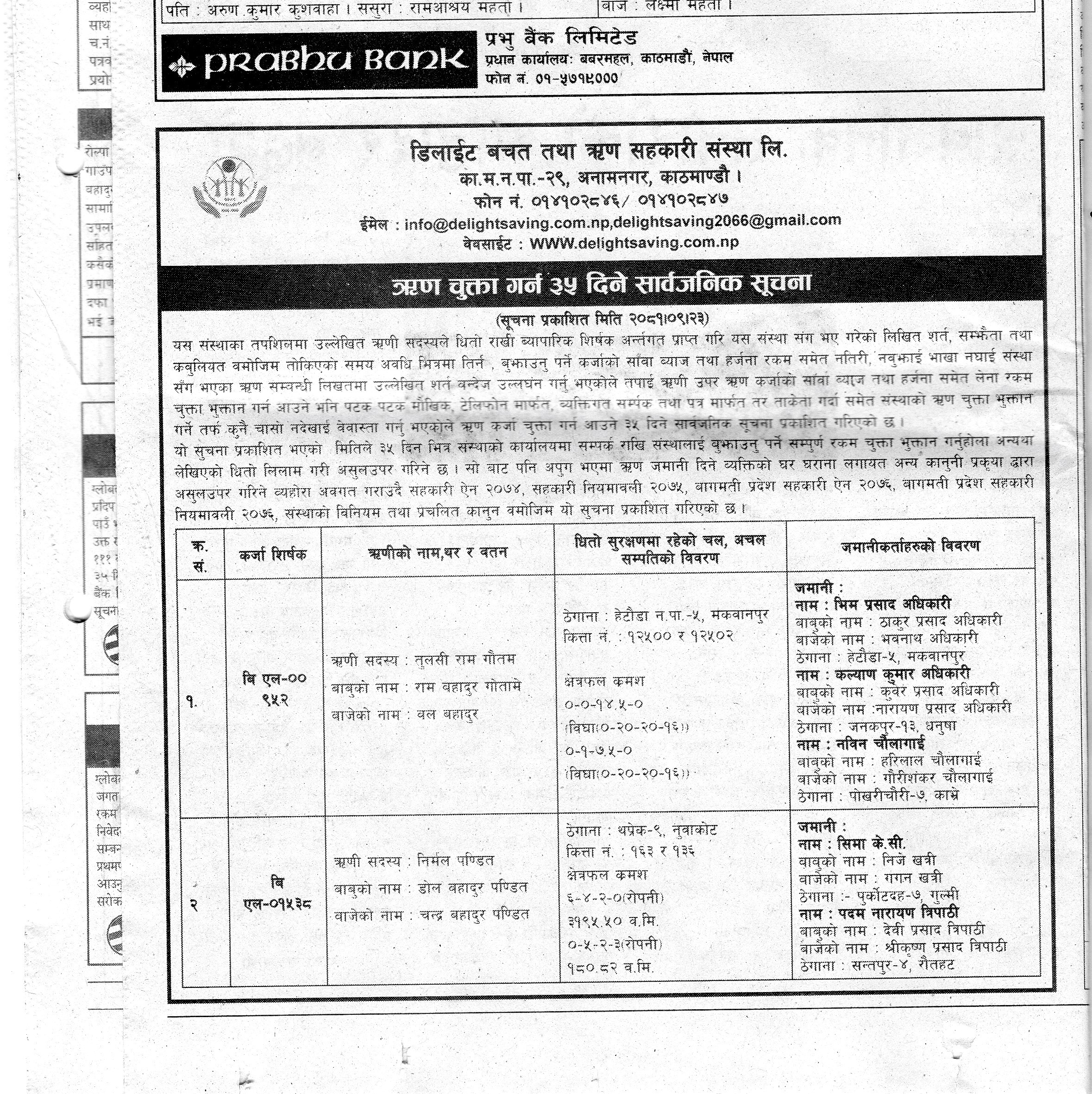 ऋणिले कर्जा चुक्ता नगरेको कारण चुक्ता गर्ने ३५ दिने अन्तिम सुचना पत्रिका मार्फत प्रकाशन गरिएको छ ।